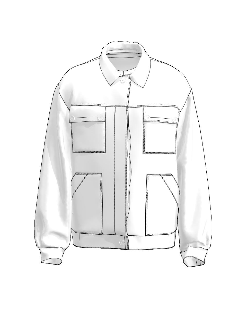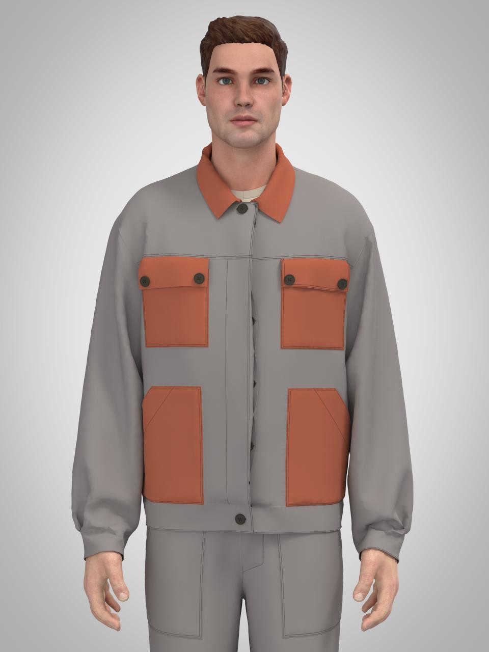 Спинка і пілочка з відрізною кокеткою. Нагрудні кишені накладні з клапаном, нижні кишені накладні зі скошеним входом. Застібка супатна. На спинці склади.