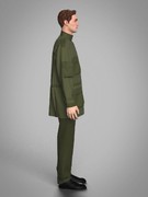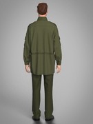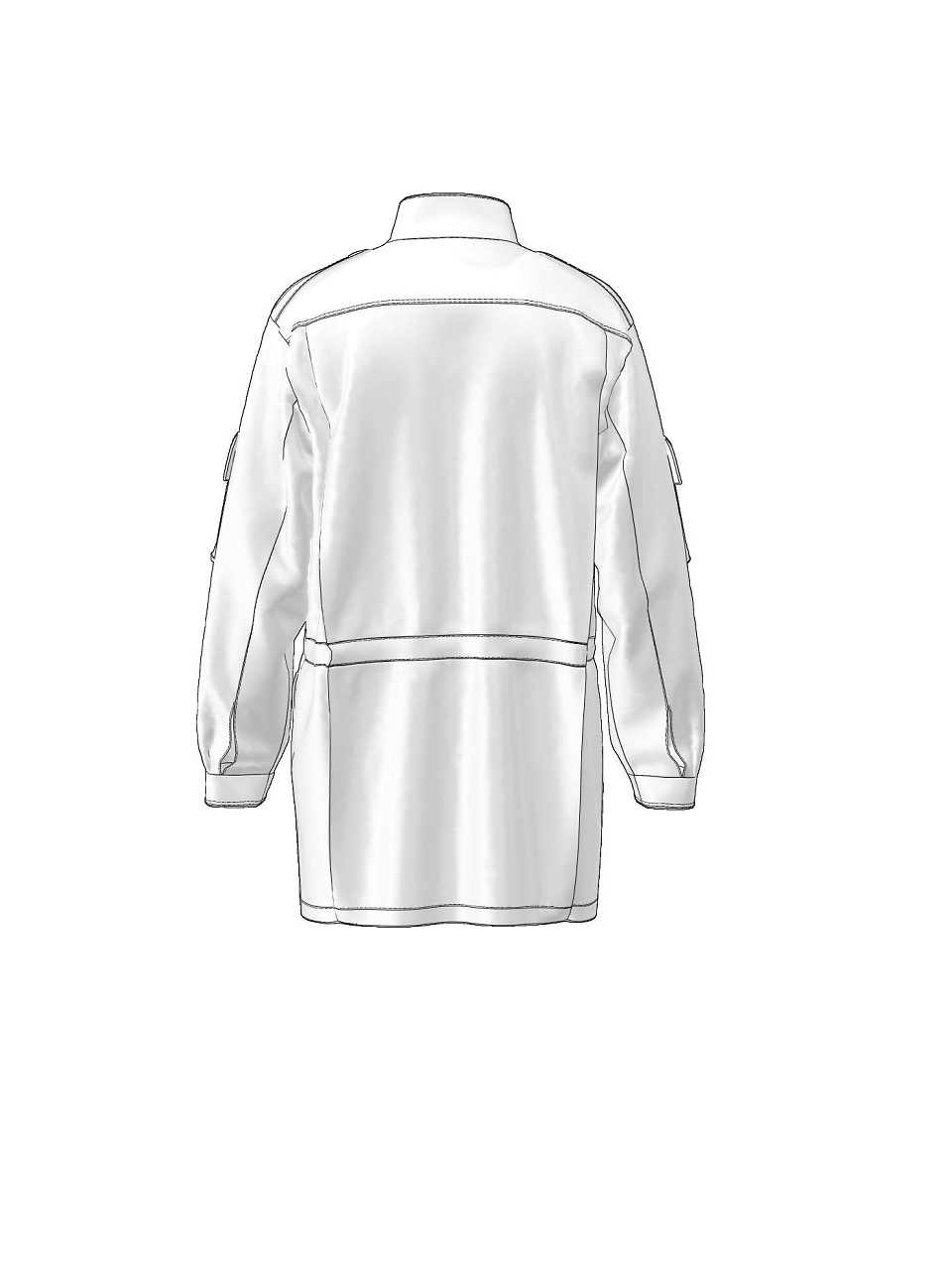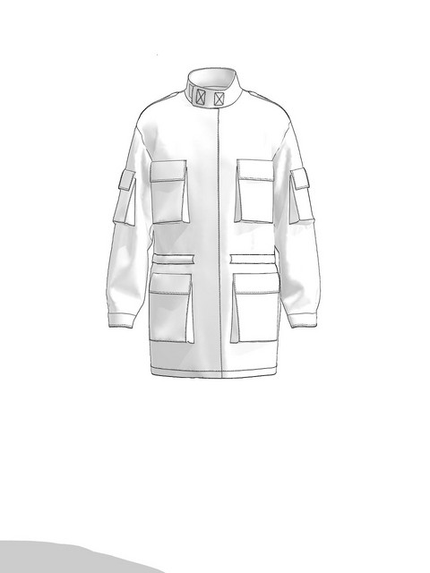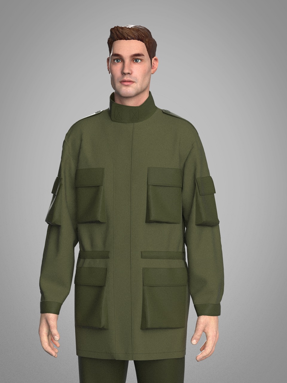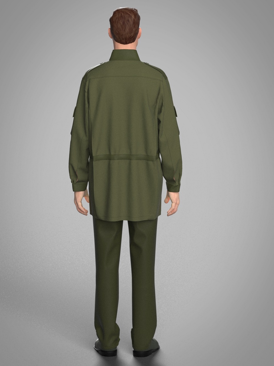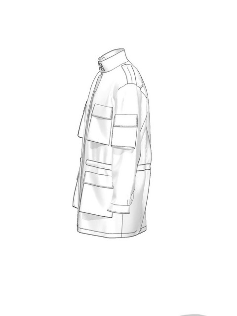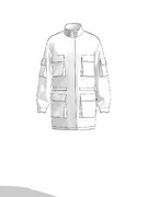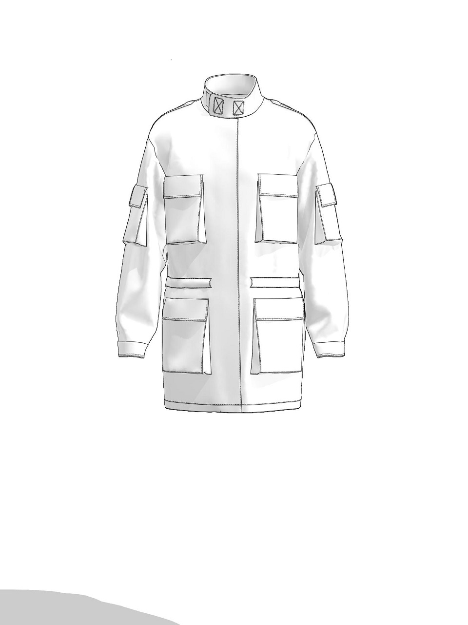 Куртка пряма подовжена. Спинка з відрізною кокеткою, з двома боковими складами по верхньому і нижньому зрізах. Кишені нагрудні та нижні накладні, об”ємні з клапаном. На плечових швах пагони. По лінії талії куліса. Комір-стійка, застібається на текстильну застібку (можливий комір відкладний). Застібка центральна супатна на 4 гудзики і петлі. Рукав втачний двошовний на манжеті з гудзиком.
