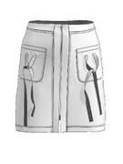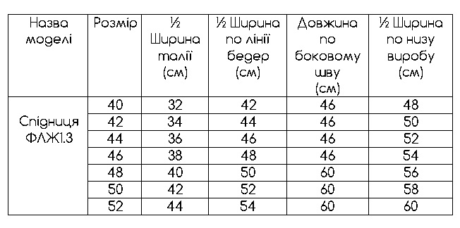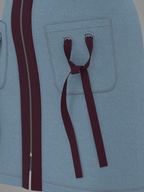 Спідниця трапецивидного силуетуНа задній половинці виточки, верхній зріз оброблений обтачкою.На пілочці накладні кишені з декоративними зав’язками. Верхній зріз оброблений обтачкоюЗастібка центральна, роз’ємний замок