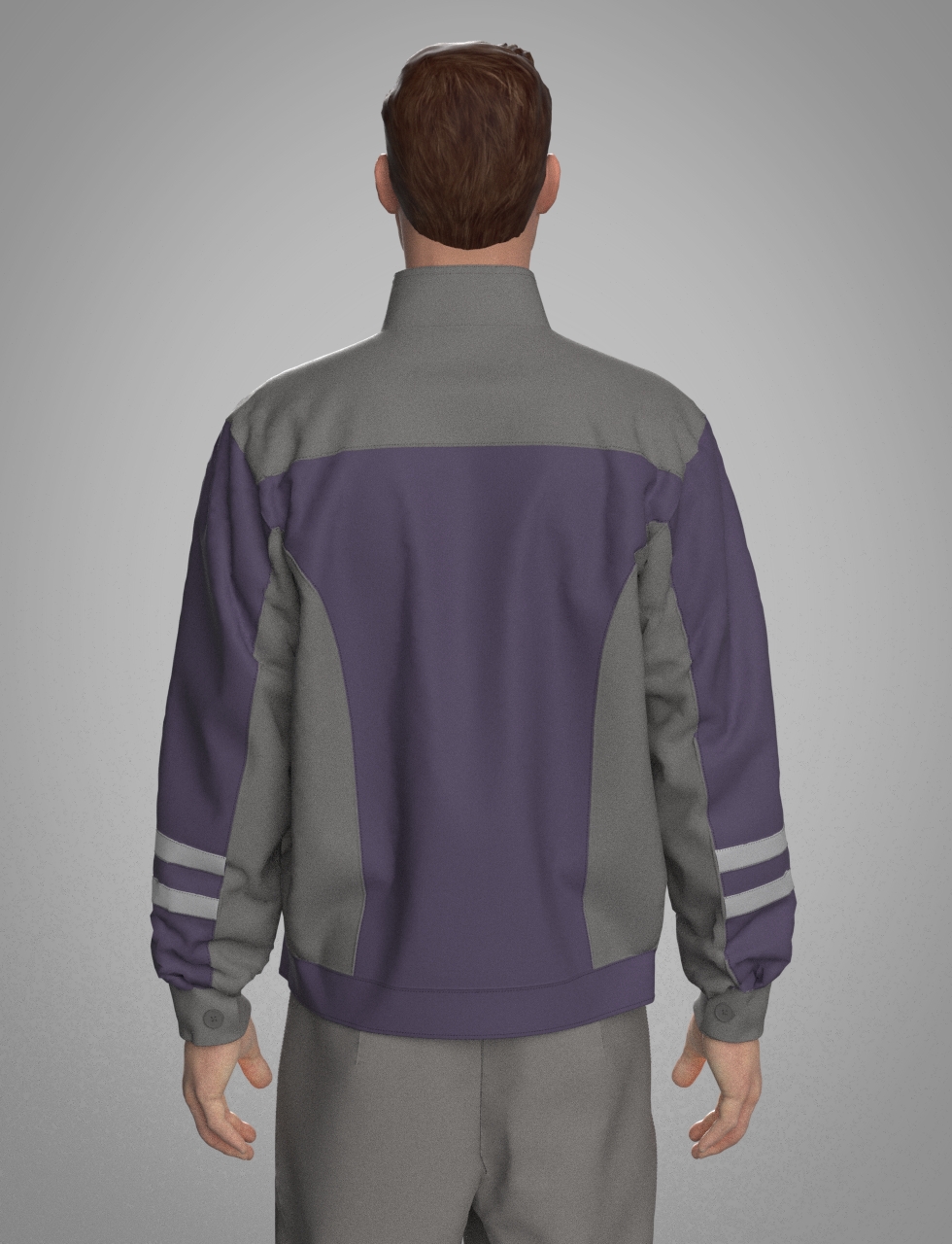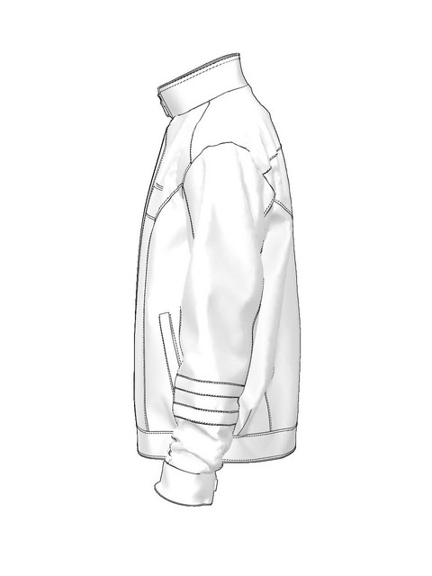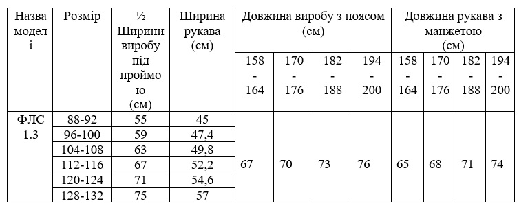 Комір-стійка. Застібка центральна до верху, відкрита. Рукав вшивний, трьохшовний, на манжеті з гудзиком.