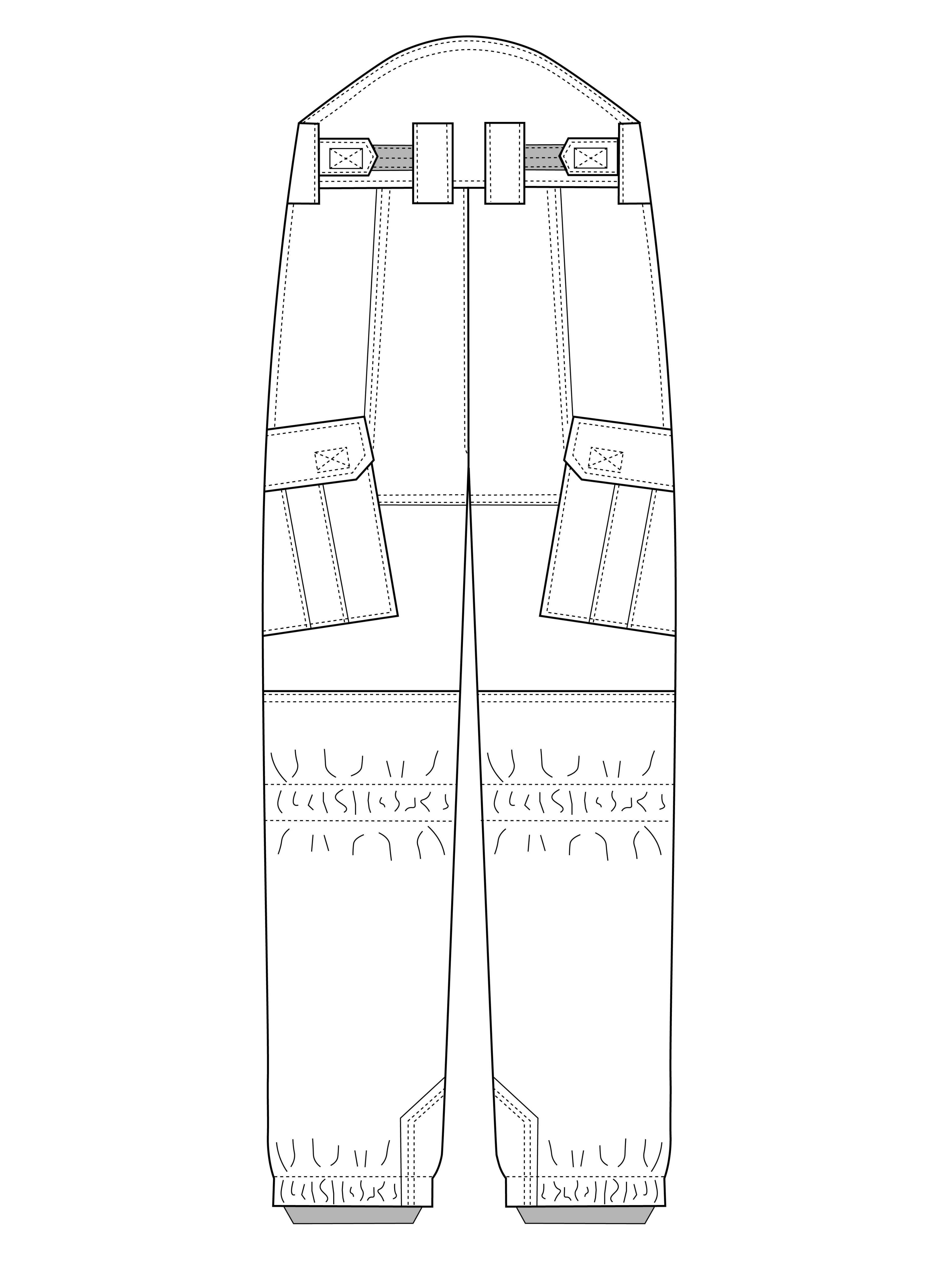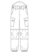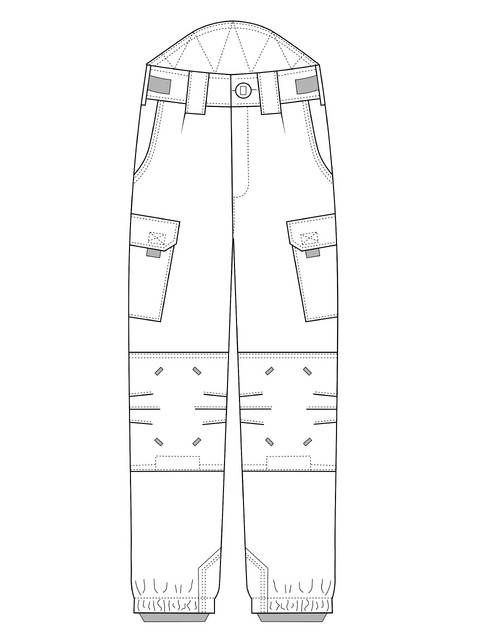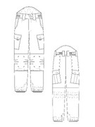 Передня половинка з складкою на поясі, та боковою кишеню. На ділянці колін передньої половинки розміщені по