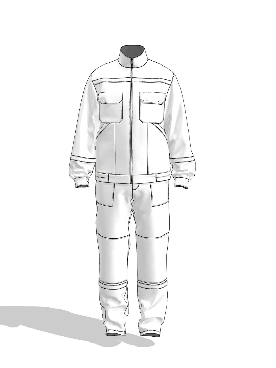 Куртка укорочена на притачном поясе. Спинка и пилочка с отрезной кокеткой. Карманы накладные. Нагрудный карман под клапаном, нижний со скошенным входом в карман. Воротник-стойка.