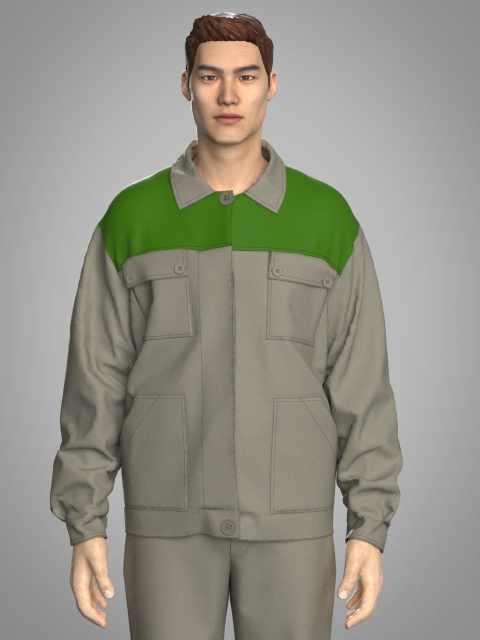 Карманы накладные: 2 боковых со скошенным входом в карман и 2 нагрудных кармана с клапаном. Воротник отложной.