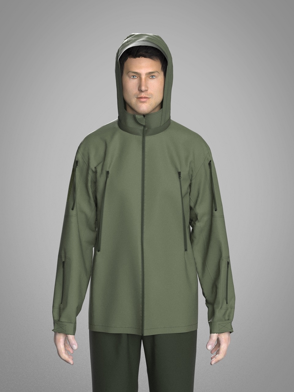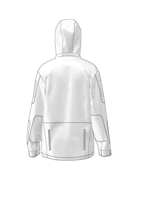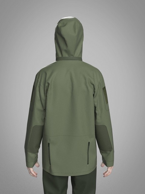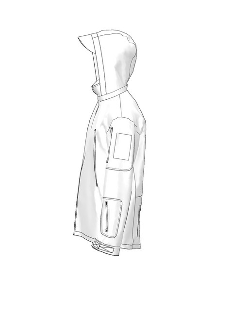На передній половині дві нагрудні кишені в листочку, вентиляційні блискавки під пахвами, дві кишені на задній половинці куртки.