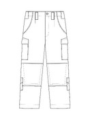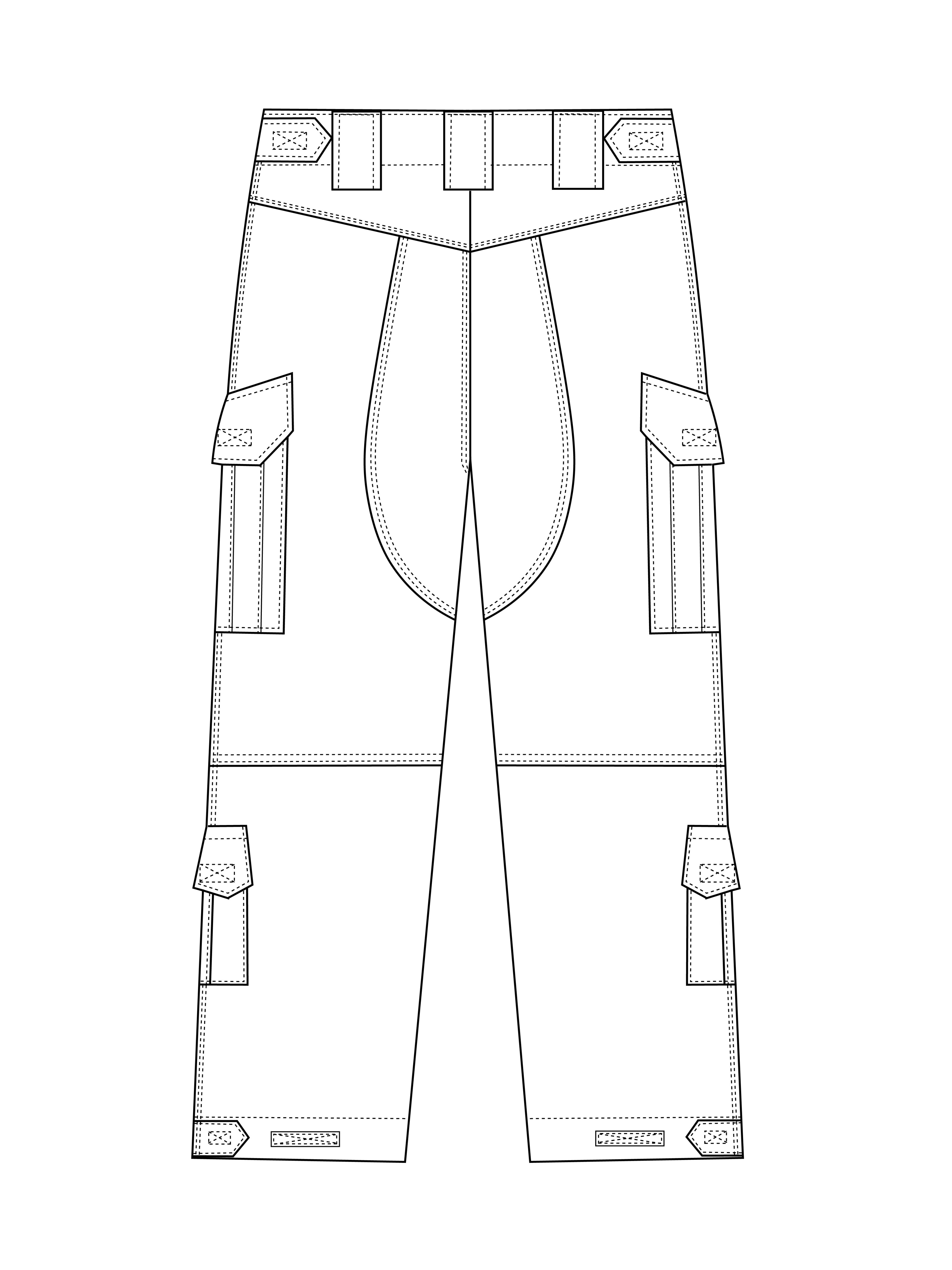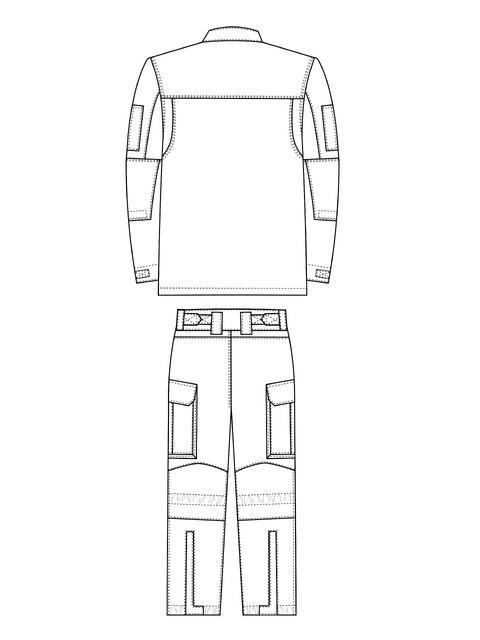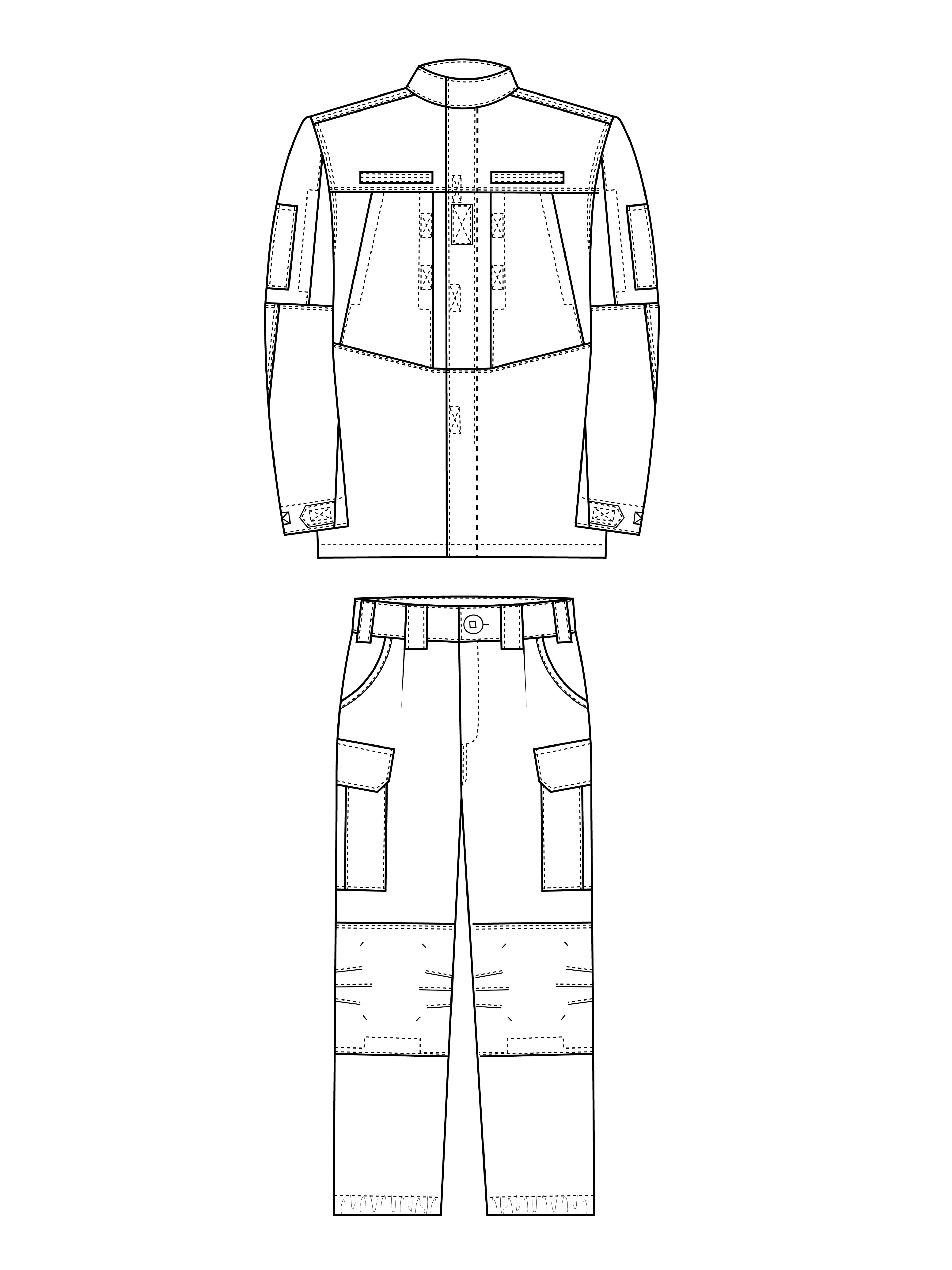 БРЮКИ ВІЙСЬКОВІ прямого силуету з цільновикроєним поясом, який застібається на ґудзик, та тасьму «блискавку», з відрізними бочками, що утворюють кишені. Передні половинки з м`якими складками. На ділянці колін на передніх половинках посилюючі накладки у вигляді кишень, для демпферних вставок.