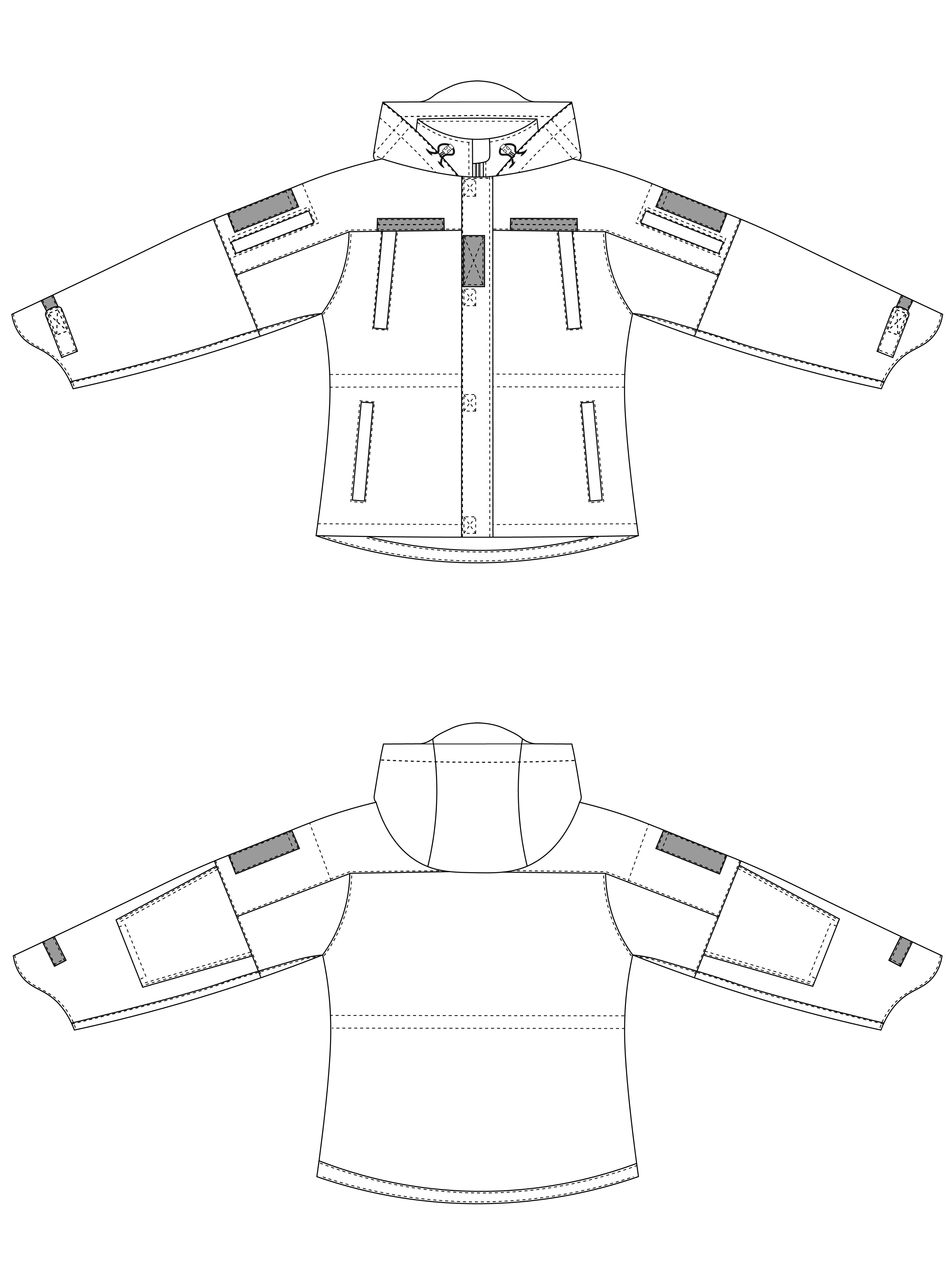 Виріб має комбінований рукав, вшивний капюшон, комір-стояк, куліси по лінії талії та низу.