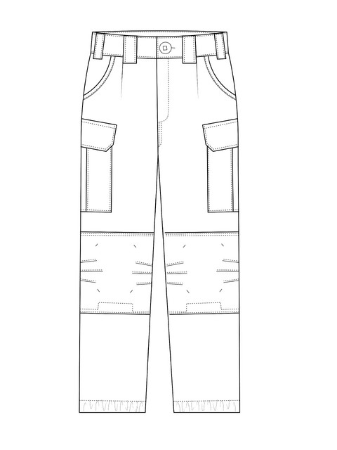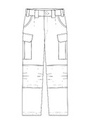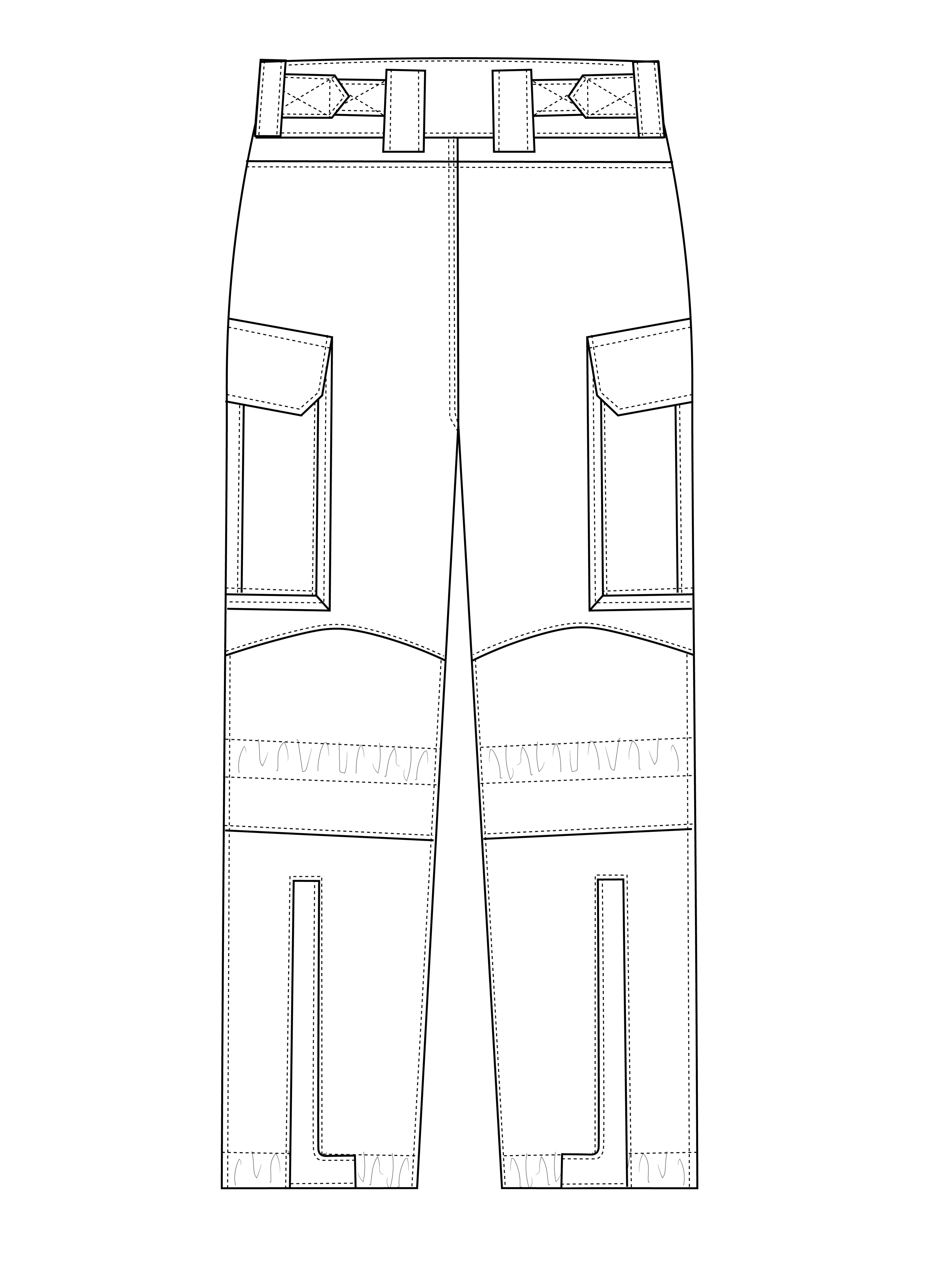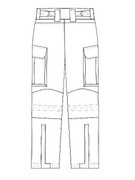 Передні половинки з м'якими складками ,з відрізними бочками,, які утворюють бокові кишені. На ділянці колін передніх половинок розміщені по три виточки з кожного боку та спеціальні підсилюючі накладки у вигляді кишень, які по нижньому краю застібаються на текстильну застібку.