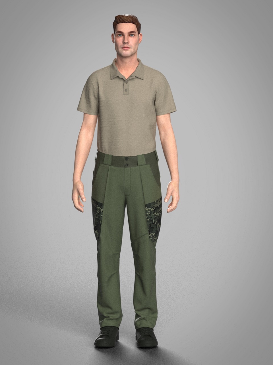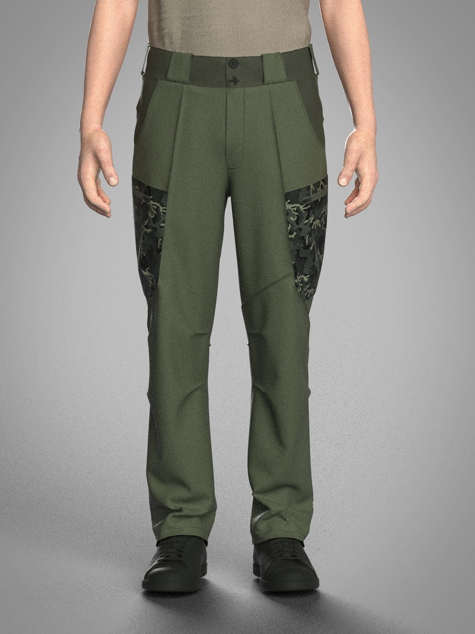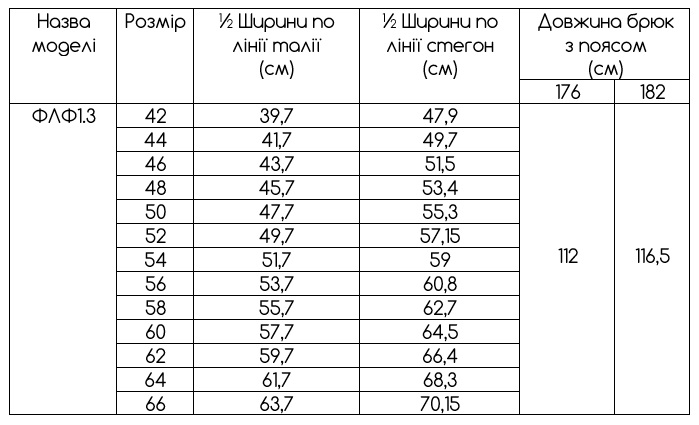 Передня половинка брюк складається з трьох частин. Верхня частина з вертикальним підрізом.